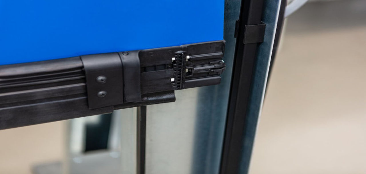 Leichtes und widerstandsfähiges Torblatt aus gewebeverstärktem PVC (1,5 mm). Auf Wunsch steht kostenfrei ein transparentes Sichtfenster zur Verfügung.